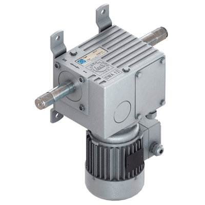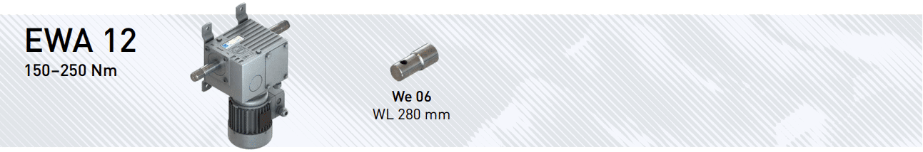 EWA 12 to elektryczna, samohamowna podwójna przekładnia ślimakowa o momencie 150–250 Nm, wyjątkowo cicha i bezobsługowa. Posiada wyłącznik krańcowy END 20 (580 obrotów wału) oraz opcjonalne sterowanie LSC 40.10 (AC/DC). Silniki wielozakresowe dla 50/60 Hz (m.in. 400 V 3~, 230 V 1~, 208/480 V 3~, 120/240 V 1~), IP55, S3-40%. Dostępna z wałem WE 66 lub WE 06.