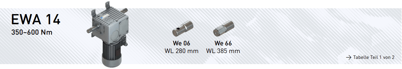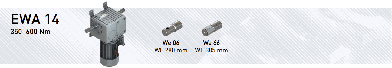 EWA 14 to elektryczna, wyjątkowo cicha i bezobsługowa podwójna przekładnia ślimakowa o momencie 350–600 Nm. Standardowo jest samohamowna, a szybkie wersje EWA 14.2539 i EWA 14.2060 są dostępne bez samohamowności. Wyposażona w wyłącznik krańcowy END 20 (580 obrotów wału) oraz opcjonalne sterowanie LSC 40.10 (AC/DC). Silniki wielozakresowe 50/60 Hz, IP55, S3-40%. Standardowy wał WE 66, a do 450 Nm także WE 06.