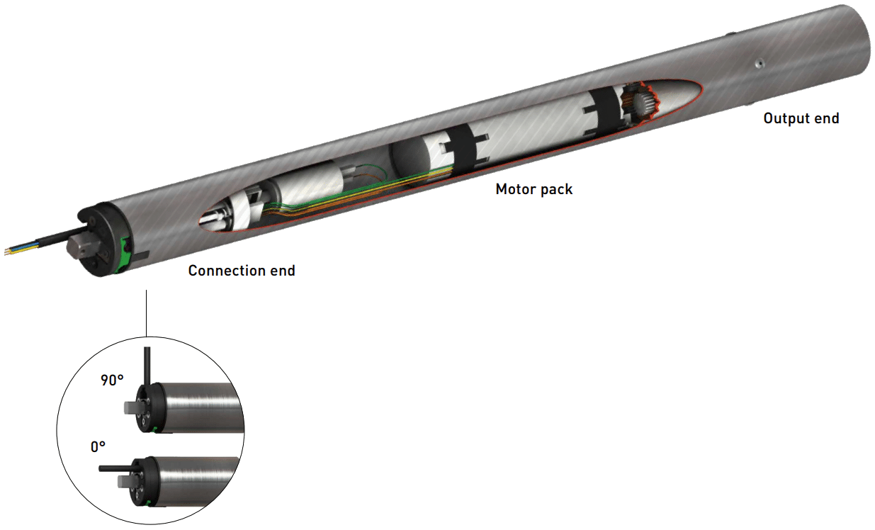Silnik współpracuje z rurą aluminiową 50 x 1,5 lub 63 x 1,5 mm do połączenia za pomocą złącza z rurą rolkową 50 / 63 mm. Dodatkowo dostępny jest sworzeń wału 12 x 12 lub 16 x 16 mm z zawleczką do połączenia z systemem prowadzącym, co ułatwia integrację mechaniki napędu z konstrukcją.