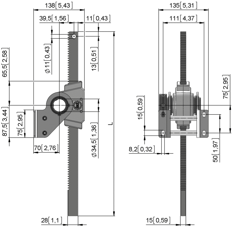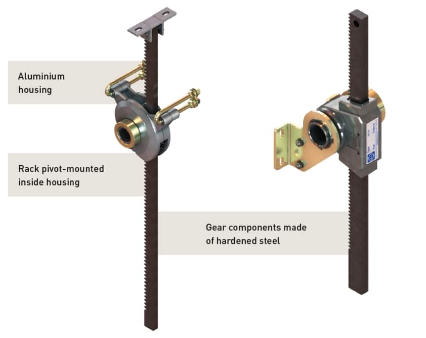 Listwa zębata i zębatka wykonane są z hartowanej stali, co zwiększa odporność na zużycie i pozwala utrzymać stabilne parametry pracy w długim okresie, nawet przy intensywnej eksploatacji i dużych obciążeniach.