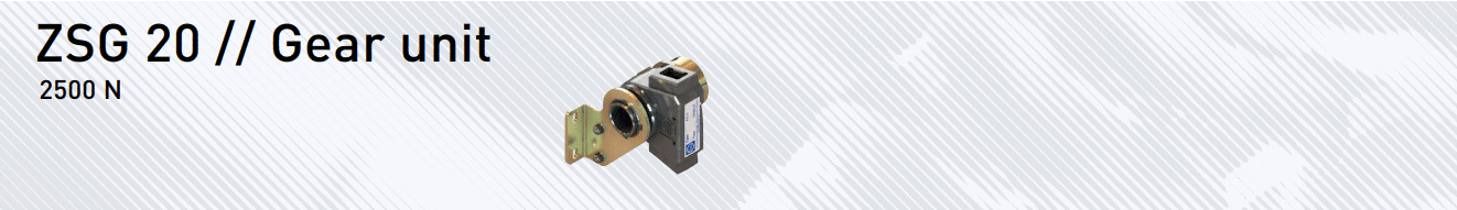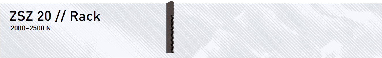 Listwa zębata z kołem zębatym ZSG 20 to zespół do regulacji ciężkich obiektów o sile ciągu/nacisku do 2 500 N. Posiada wbudowane łożysko dla rury łączącej napędu i umożliwia idealną synchronizację dzięki mechanicznemu połączeniu kilku elementów. Listwa i zębatka są z hartowanej stali, możliwe odchylenie listwy do 190°, skoki 600–1800 mm, w zestawie smar LUB 20.
